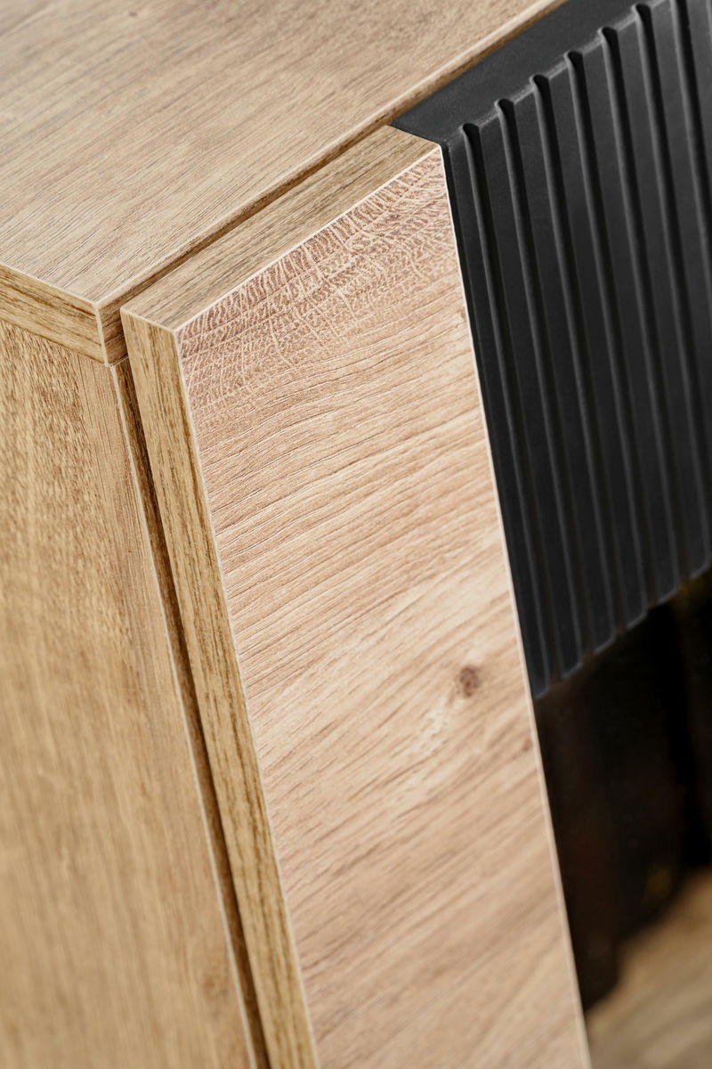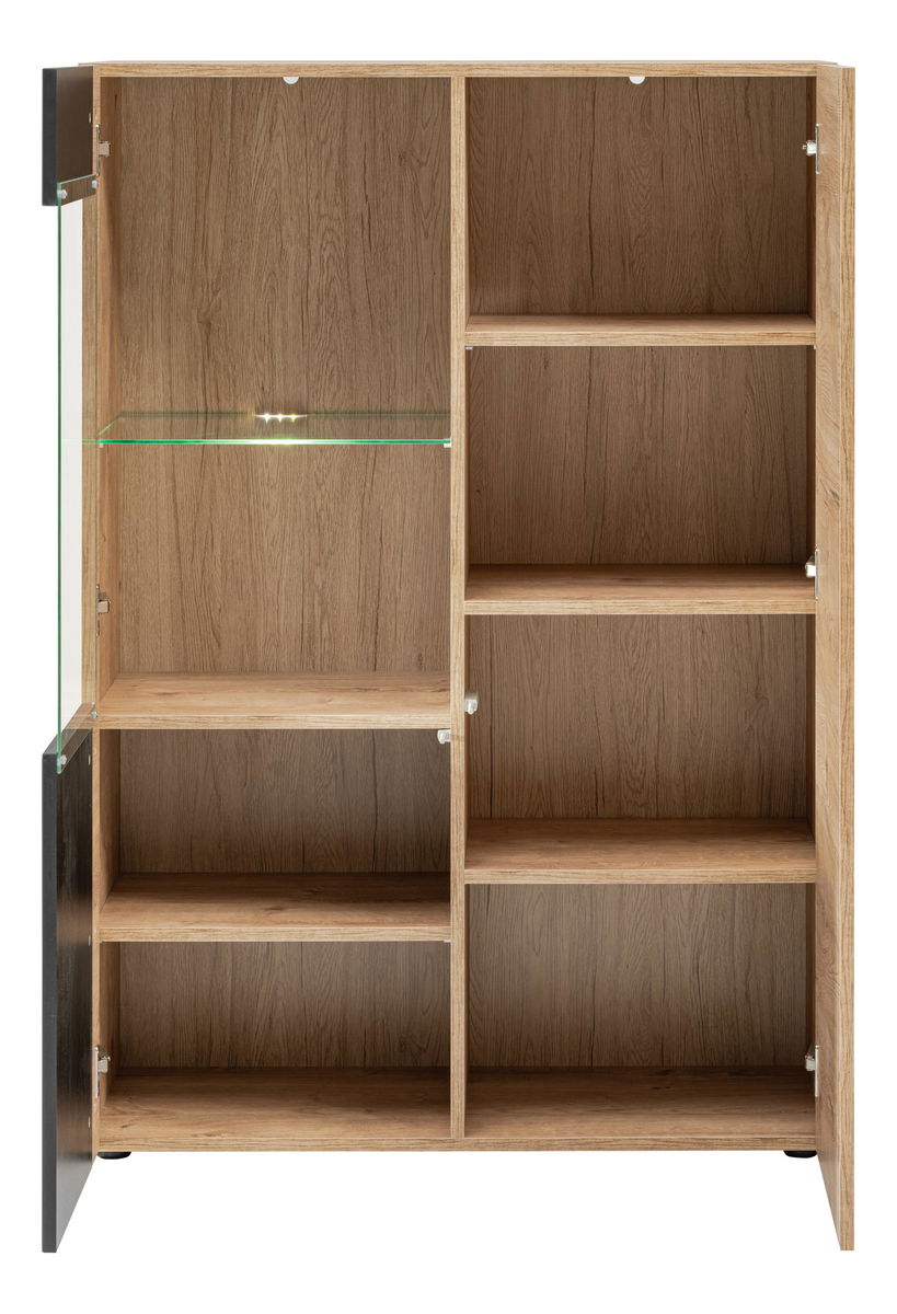 Objavte štýlový spôsob, ako skombinovať dizajn s praktickým úložným priestorom. Nízka vitrína Aruno zaujme už na prvý pohľad – jej dvierka v kombinácii dub ribbeck a výrazné čierne drážky vytvárajú moderný kontrast, ktorý dodá vášmu interiéru charakter a šmrnc. V ľavej časti vitríny nájdete čiastočne presklené dvierka, za ktorými sa ukrýva sklenená polica, ideálna na vystavenie dekorácií, pohárov či obľúbených kúskov a bežné police na praktické uskladnenie. Pravá strana s plnými dvierkami ponúka priestor ideálny na predmety, ktoré nemusia byť na očiach. Kombinácia presklených a plných dvierok spája funkčnosť a dizajn, vďaka čomu je vitrína vhodná do každého moderného interiéru.