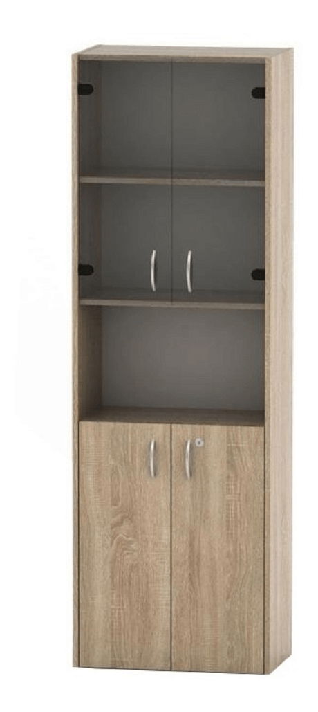 Vitrína Asista AS 004 v dub Sonoma farbe s výškou 175 cm a hĺbkou 34 cm je ideálna pre kancelárske využitie. Vitrína má sklenené dvierka v hornej časti a uzamykateľné drevené dvierka a jednu poličku v dolnej časti. V strede sa nachádza otvorený odkladací priestor. Tento produkt patrí k sektorovej zostave Asista, ktorá je vhodná na zariadenie kancelárií, pracovní, školských učební alebo zasadacích miestností. Materiál je DTD laminovaný s ABS hranami a má možnosť výberu z farebných prevedení: buk, dub Sonoma, Bardolino tmavé a čerešňa. Rozmery vitríny sú 57x34x175 cm s hrúbkou materiálu 16 mm a zámkami na oboch dverách. Produkt je dodávaný v demonte.