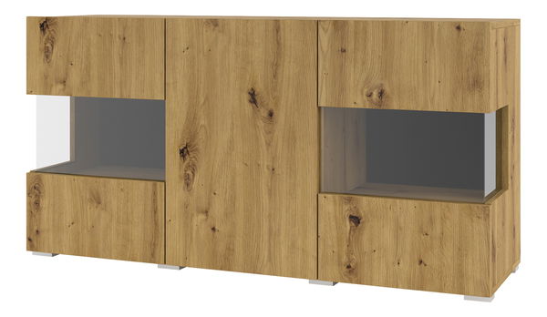 Vitrína Avernic Typ 25 (čierna + dub artisan) je moderná skrinka s piatimi poličkami a tromi dverami, z ktorých dve majú sklenenú časť. S celkovou výškou 62 cm a hĺbkou 35 cm sa hodí aj do menších miestností. Vitrína môže byť zavesená na stenu a dokúpiť sa k nej môže aj osvetlenie. Materiálom, z ktorého je vitrína vyrobená, je laminovaná doska. Vďaka svojmu modernému prevedeniu a praktickému rozmiestneniu poličiek je vitrína vhodná pre každého, kto hľadá funkčné a štýlové úložné riešenie pre svoje domácnosti.