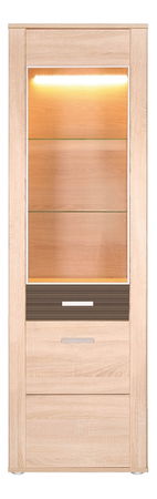 Štýlová vysoká vitrína s uzatvoreným úložným priestorom na spodku a jednou zásuvkou umiestnenou v strede. V strednej a hornej časti sa nachádza presklený priestor vitríny s dverami a dvomi poličkami z číreho skla. Tenký vodorovný sivý úchyt a tenké minimalistické sivé nožičky dodávajú štýl. Možnosť dokúpiť osvetlenie LED BA 500. Tlmič dverí, ktorý poskytuje jemné zatváranie je v cene produktu.