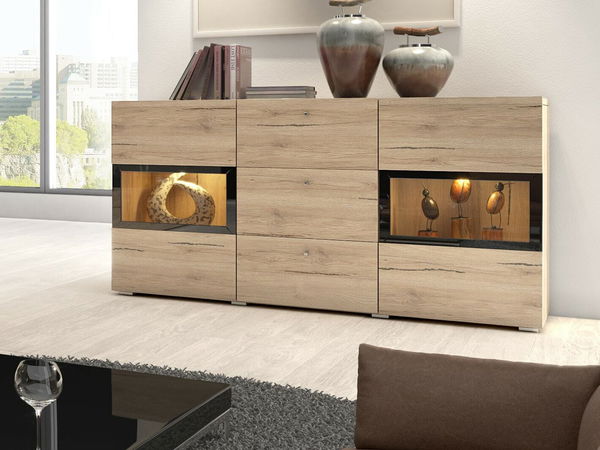 Elegantná vitrína, ktorá má presklenú ľavú a pravú časti do ktorých si môžete dokúpiť LED osvetlenie. V strede sa nachádzajú tri zásuvky na koľajničkách. Vitrýnu dodávame v demonte.