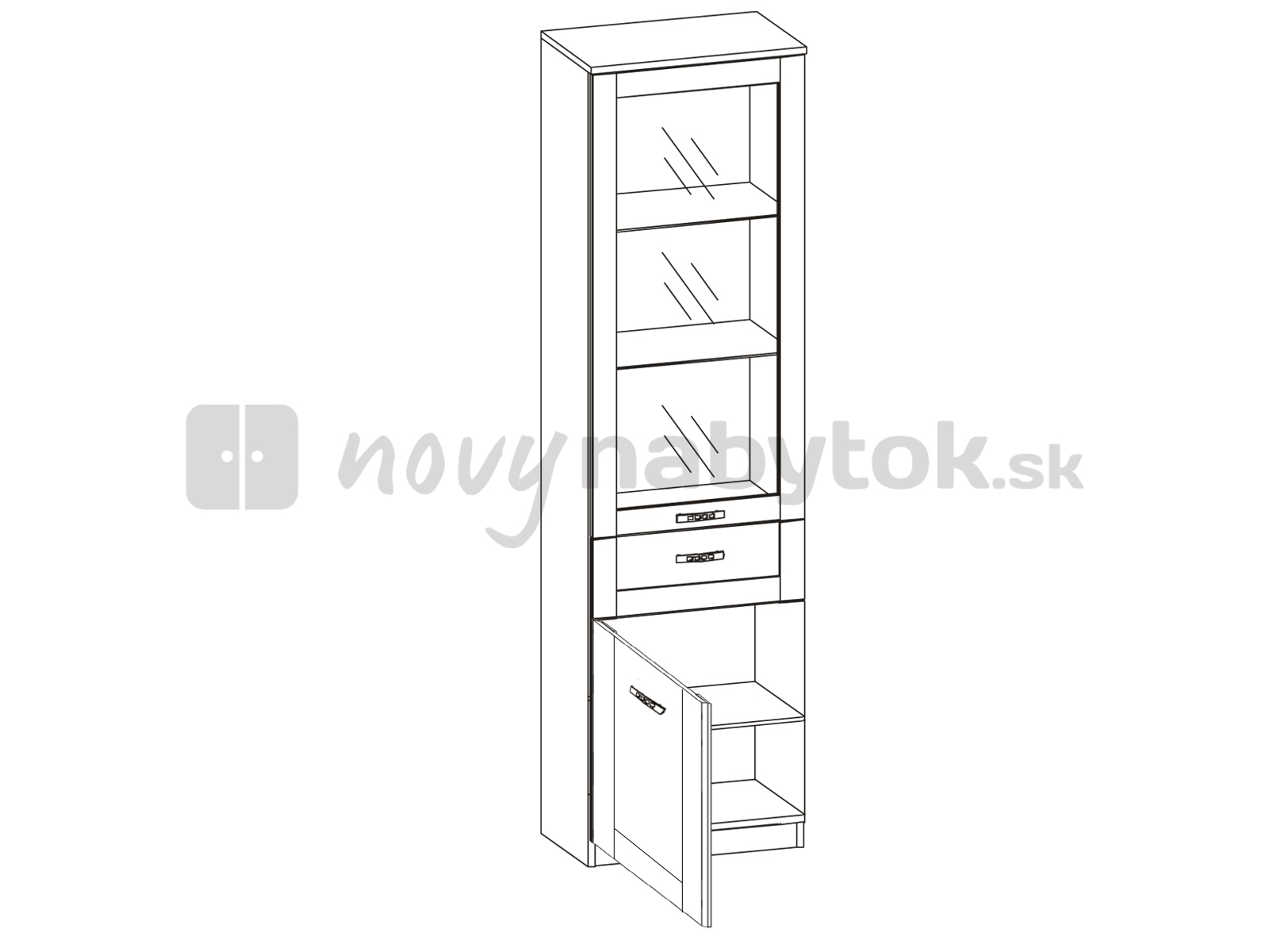Vysoká vitrína s jednými sklenenými dvierkami vo vrchnej časti a drevenými dvierkami v časti spodnej. Stred vitríny tvori jedna zásuvka.