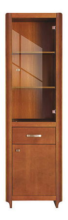 Vitrína s jednou zásuvkou a drevenými dvierkami s jednou poličkou vo vnútri. Za čírou presklenou časťou sú dve drevené poličky. Klasický dizajn dopĺňajú kovové ozdobné úchytky.