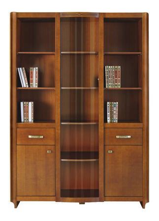 Masívna vitína s dvoma drevenými dvierkami a dvoma zásuvkami. Stredná časť vitríny so štyrmi poličkami je presklená čírym sklom a osvetlená.