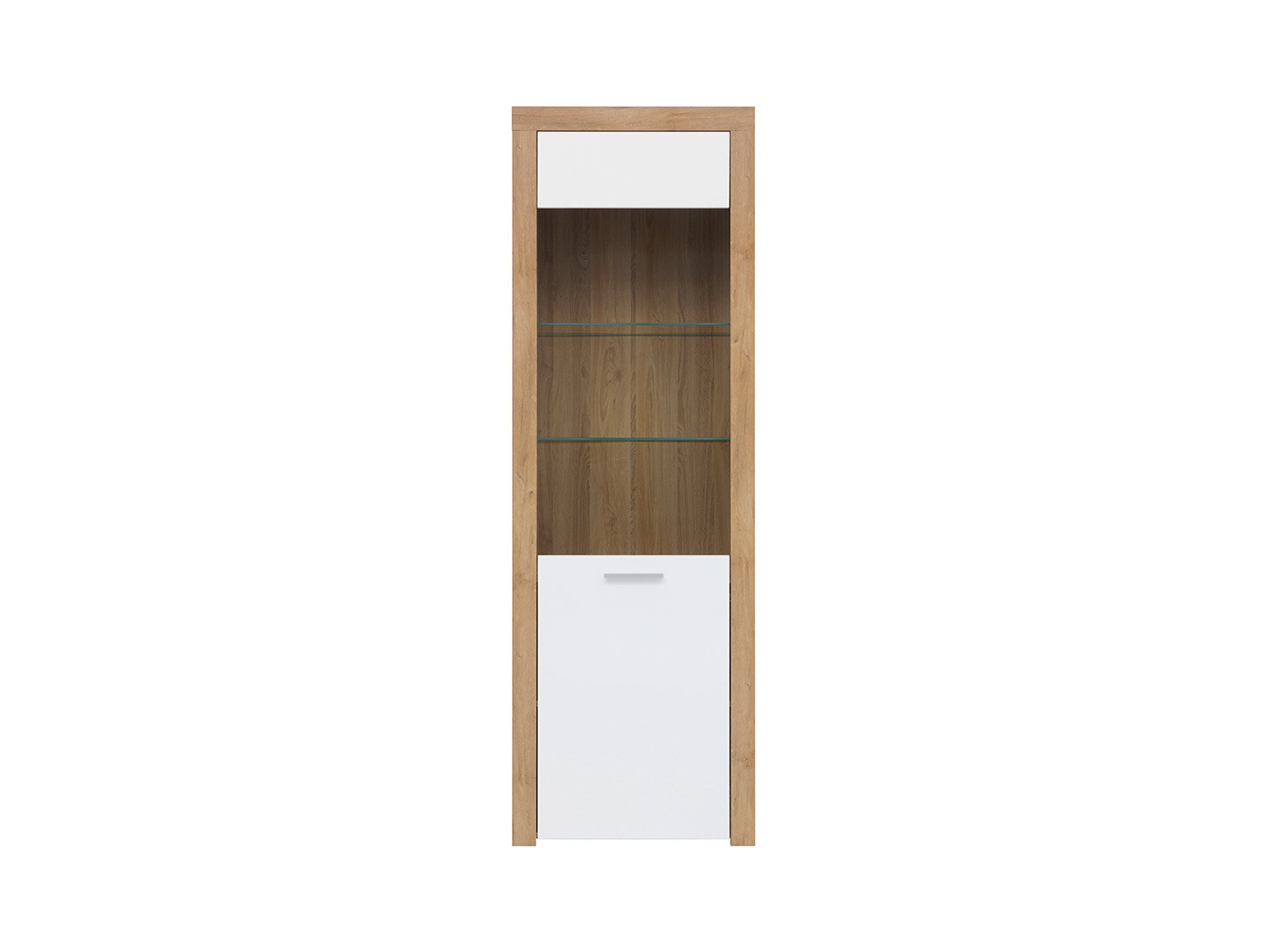Moderná vitrína vhodná do obývacej izby, či pracovne Vám poskytne priestor pre Vaše obľúbené dekorácie, sklo, či porcelán. V jej hornej presklenej časti sa nachádzajú dve sklené poličky. Dvierka majú tenší podlhovastý úchyt.