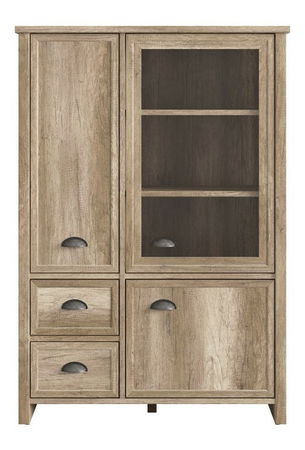 Kombinovaná vitrína v provensálskom štýle s kovovými úchytkami. Obsahuje skrinkovú časť s presklenými dvierkami. Skrinková časť s plnými dvierkami obsahuje dve plné police a dve zásuvky.