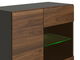 Moderná vitrína je rozdelená na hornú a dolnú časť. Horná časť je delená deliacou stenou. Časť s plnými dvierkami obsahuje 1 plnú policu a časť s vitrinovými dvierkami obsahuje 1 sklenenú policu. V ponuke je úsporné LED osvetlenie sklenej police. Dolná časť obsahuje 1 plnú policu po celej šírke skrinky.