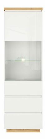 Vitrína Erla REG1W2S s výškou 196 cm a hĺbkou 41 cm je vyrobená z dubu minerva a biely lesk dokonale doplní každý moderný interiér. Dvierka vitríny sú vyrobené z tvrdeného skla, vnútri sa nachádzajú dve plné poličky a jedna sklenená polička. Ak by ste chceli, môžete dokúpiť LED osvetlenie pre sklenenú poličku. Spodná časť vitríny obsahuje dve zásuvky na uskladnenie vecí. Táto moderná vitrína z kolekcie Erla sa stane praktickým doplnkom do vášho obývacieho priestoru.