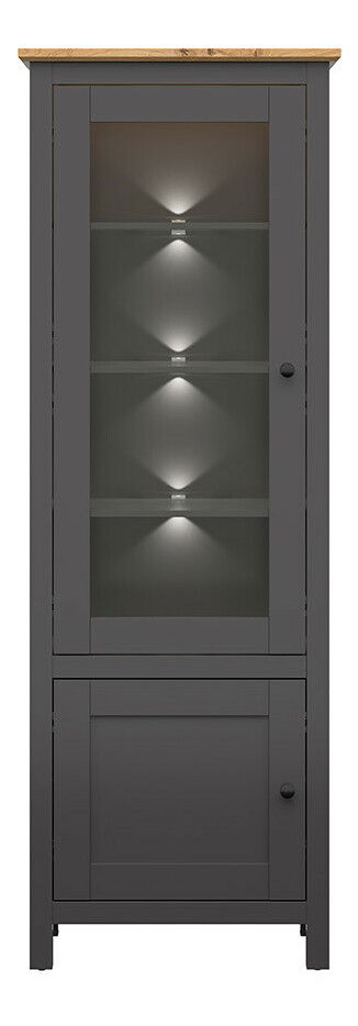 ZobraziťVitrína Hesen - REG1W1D/20/7 s LED osvetlením (grafit + dub artisan) má výšku 203 cm, šírku 71 cm a hĺbku 44 cm. Je určená na ukladanie kníh, drobností a cenných doplnkov. Vitajte svojich hostí na popoludňajší čaj a šálku obľúbeného nápoja. Vitrína obsahuje 3 police za skleneným frontom z tvrdeného skla a skrinku s 1 policou, ktorá delí vnútro na 2 priehradky. Elegantná farebnosť a vzor napodobňujúci štruktúru dreva s okrúhlymi úchytkami poskytujú jemné ozdoby. Viditeľné police sú vybavené LED osvetlením, ktoré zdôrazňuje vaše výrazné dekoračné prvky. Štandardne sú zahrnuté aj panty so zabudovaným tichým zatváraním, ktoré umožňujú bezproblémové otváranie a zatváranie skrinky. Vitajte do vašej domácnosti vitrínu Hesen - REG1W1D/20/7 s LED osvetlením v grafitovej a dubovej farbe.
