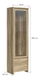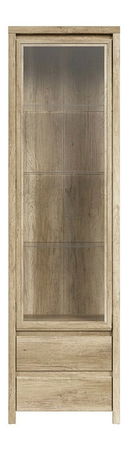 Úzka elegantná vitrína s presklenými dvierkami, tromi sklenenými poličkami a dvomi zásuvkami v spodnej časti. Určite vás osloví jednoduchým, no elegantným dizajnom. Vitrína je vhodná pre všetky vaše dekorácie, doplnky alebo porcelán.
