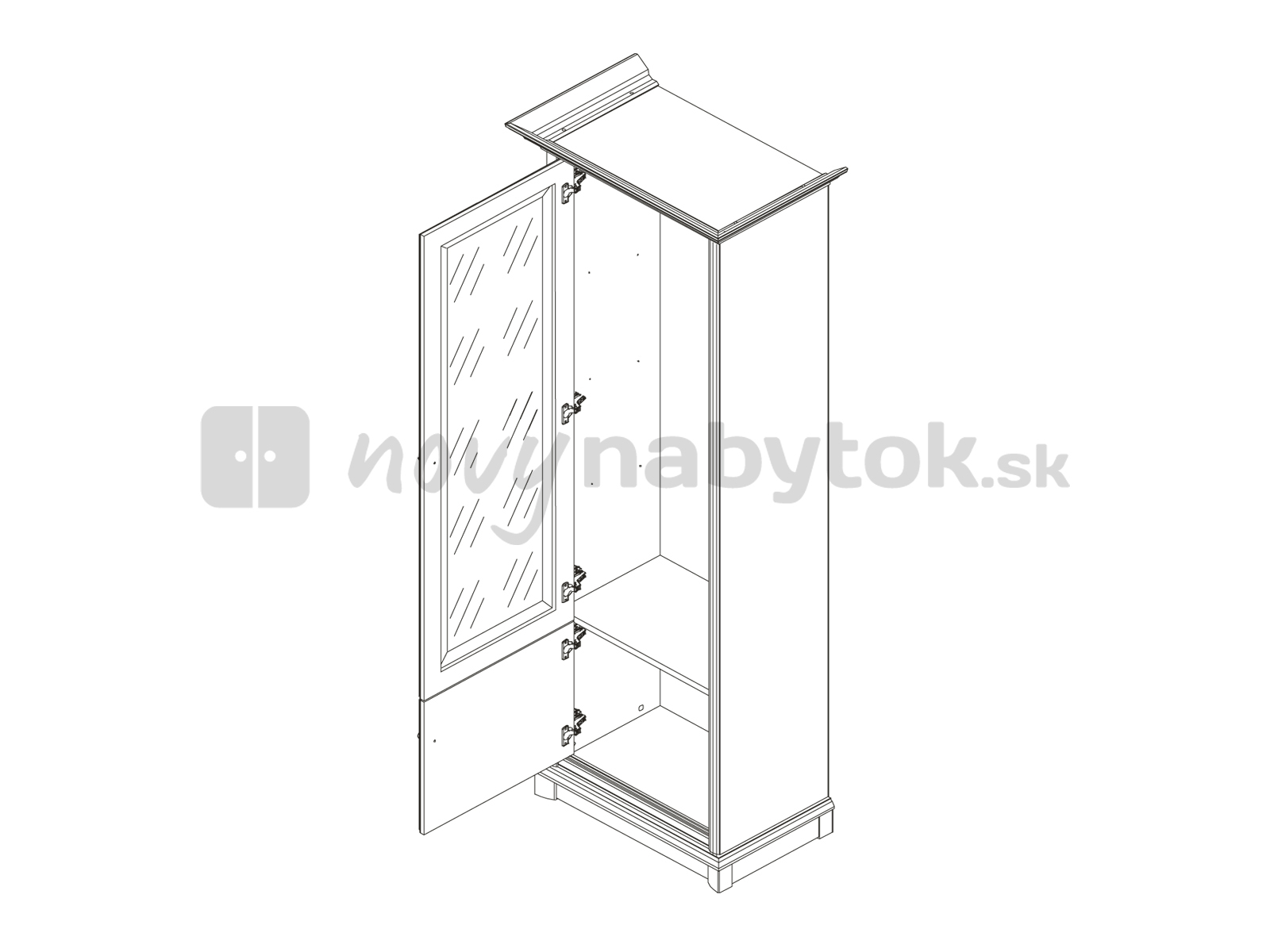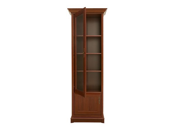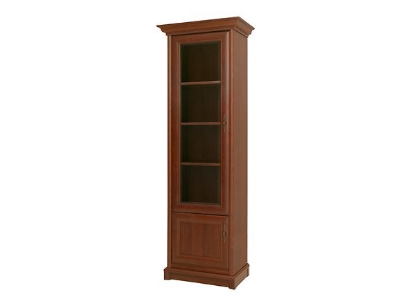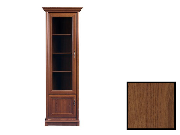 Vitrína KENT EWIT 1DL (Gaštan) výška 204,5 cm hĺbka 43 cm je úzka vitrína, ktorá sa hodí najmä do rustikálne zariadených domácností. Má presklené dvierka s čírym sklom a menšie dvierka v spodnej časti. Vitrína má tri poličky, na ktorých si môžete umiestniť vaše dekoračné predmety, porcelánové súpravy alebo iné doplnky. Jemné kovové úchyty dopĺňajú krásny dizajn vitríny. Tento model je určený pre ľavé prevedenie vitrín. _x000D_ Sektorový nábytok Kent je ideálny pre tých, ktorí milujú rustikálny štýl a chceli by svojim interiérom dodávať historický nádych. Rad Kent obsahuje elegantné komody, stolíky, presklené vitríny, skrine s vyrezávanými prvkami a ozdobnými kovovými úchytkami. Všetko s archaickým nádychom, ale s praktickým využitím v súčasnosti. Tento nábytok sa hodí do pracovne, jedálne alebo obývačky a dodá im dôstojnosť, noblesu a eleganciu. Pokiaľ sa rozhodnete pre Kent sériu, budú vám určite všetci závidieť tento nádherný a praktický nábytok.