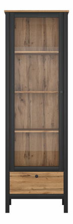 Zariaďte si obývaciu izbu štýlovo a moderne s touto úzkou vitrínou. Vo vnútri skrinky sa nachádzajú tri police a v spodnej časti sa nachádza ďalší úložný priestor v podobe zásuvky na kovových koľajničkách. Dvierka sa dajú namontovať na ľavú a aj pravú stranu.