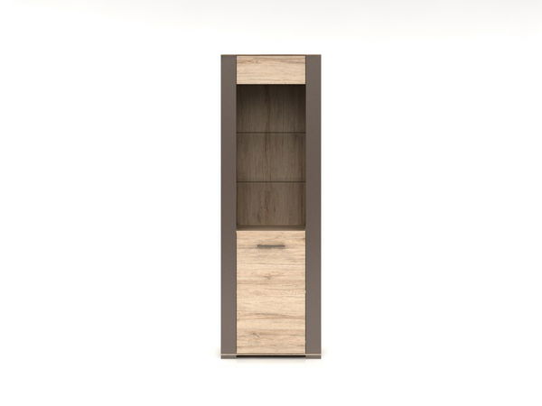 Nechajte vyniknúť vaše dekorácie a doplnky v tejto vysokej a úzkej vitríne. Vitrína má okrem sklenených poličiek aj drevené poličky. Pre väčší efekt je možné priobjednať doplnkové osvetlenie sklenených poličiek. S osvetlením sa zvýraznia všetky vaše doplnky. Dvierka vitríny majú tenší úchyt.