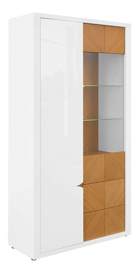 ZobraziťVitrína Rovika REG1D1W2S (lesk biely + dub prírodný) (s LED osvetlením) s výškou 202 cm a hĺbkou 42 cm je skvelou voľbou pre tých, ktorí hľadajú originálny spôsob, ako vystaviť svoje ozdobné predmety. Sklenené dvierka a LED osvetlenie zvýraznia krásu vášho porcelánu, fotografií a iných dekorácií. S vitrínou získate aj skrinku s plnými dvierkami a 2 praktickými zásuvkami na ukladanie ostatných vecí. Tiché zatváranie dvierok a zásuviek potvrdzuje, že vitrína je skvelou voľbou pre každodenné použitie. Funkcia "push to open" umožňuje ľahké otváranie zásuviek bez úchytov. Vitrína je dodávaná v demonte a je vyrobená z kvalitnej nábytkovej dosky s fornírom. Svetlo LED je súčasťou balenia.