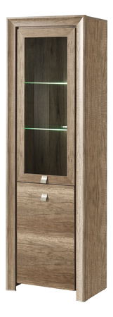 Vitrína s presklenými dverami v hornej časti a pod mini sú dvere plné. Dve sklenené poličky sú podsvietené LED osvetlením. V spodnej skrinke je jedna klasická polička. Pekné vlnovkové úchyty dotvárajú celkový dizajn nábytku. Netradičné farebné prevedenie dreva san remo mu dodáva jedinečnosť.