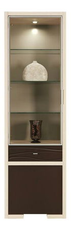 Úzka vitrína je rozdelená na tri úložné priestory. Horný presklený, dolný uzavretý dvierkami a v strede sa nachádza zásuvka. Možnosť priobjednania doplnkového osvetlenia.
