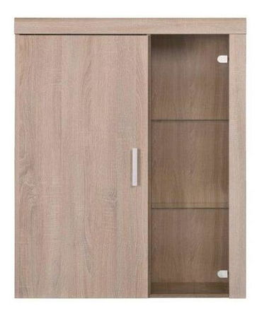 Vitrína na stenu s tromi policami na strane pravej a sklenými dvierkami z číreho skla. Na ľavej strane sa nachádzajú plné dvierka. Vitrína je vybavená tenkými šedými úchytkami minimalistického rozmeru a je vyrobená z laminovaného DTD materiálu odtieňu Dub Sonoma.