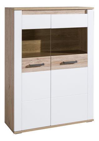 Dvojdverová vitrína s čiastočne presklenými dverami. V hornom dne sa nachádza integrovaný LED pás.