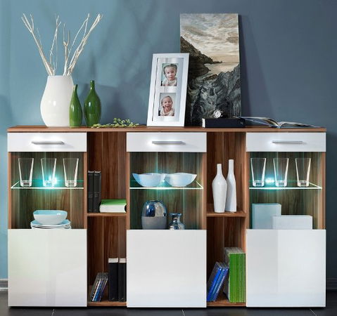 Vitrína Dorade je dizajnovaná pre poskytnutie čo najviac úložného priestoru. Je vhodné ju kombinovať s obývacou stenou Dorade no určite ju ľahko skombinujete aj s iným nábytkom. Za polopresklenými dvierkami sa nachádza LED osvetlením podsvietená sklenená polička, pod ktorou je umiestnená jedna klasická drevená. Vitríny sú oddelené otvoreným úložným priestorom s poličkou, kde si môžete umiestniť rôzne dekoratívne predmety. Nosnosť sklenenej poličky je 5 kg. Sklenené časti sú vyrobené z tvrdeného skla.