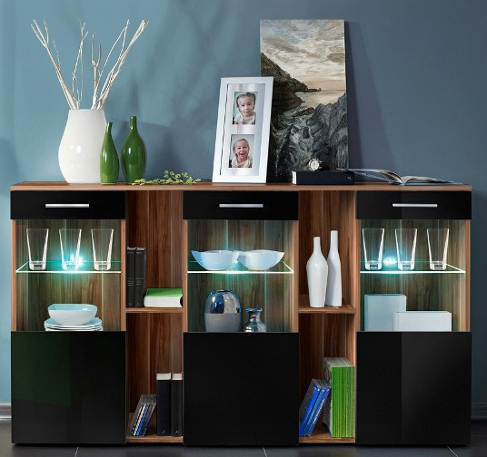 Vitrína Dorade je dizajnovaná pre poskytnutie čo najviac úložného priestoru. Je vhodné ju kombinovať s obývacou stenou Dorade no určite ju ľahko skombinujete aj s iným nábytkom. Za polopresklenými dvierkami sa nachádza LED osvetlením podsvietená sklenená polička, pod ktorou je umiestnená jedna klasická drevená. Vitríny sú oddelené otvoreným úložným priestorom s poličkou, kde si môžete umiestniť rôzne dekoratívne predmety. Nosnosť sklenenej poličky je 5 kg. Sklenené časti sú vyrobené z tvrdeného skla.
