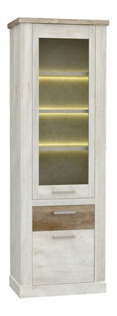 Vitrína z drevotrieskovej laminovanej dosky. Úchytky sú vo farbe nikel matný.