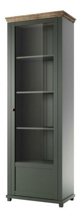 Vitrína Elvina Typ 06 (tmavozelená + dub lefkas) (P) s výškou 200 cm a hĺbkou 42 cm je ideálna na vystavenie vašich obľúbených dekorácií, porcelánu a skla. Táto vitrína má štyri police umiestnené za presklenými dvierkami, ktoré sú vyrobené z MDF dosiek hrúbky 18 mm a skla s ABS hranami. Strany sú vyrobené z drevotriesky hrúbky 15 mm. Výrazná kombinácia tmavozelenej a dubu lefkas vytvára pocit harmónie v interiéri a dokonale sa hodí k prírodným materiálom. Vitína Elvina Typ 06 nie je iba funkčná, ale aj dizajnová, vďaka svojmu vidieckemu štýlu. Všimnite si, že LED osvetlenie nie je súčasťou balenia a je potrebné si ho priobjednať.