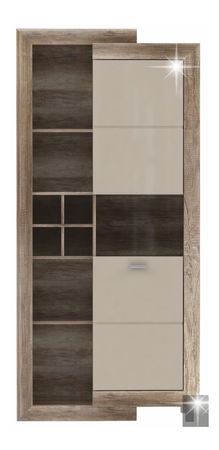 Moderná vitrína nezvyčajného dizajnu, ktorá má hrubšie orámované črty. Vitrína vám poskytne dosť úložného priestoru pre dekorácie, knižky alebo iné doplnky. Vitrína stojí na kovových nožičkách. Farebné prevedenie vitríny je dub antický a lesk béžový.