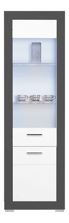 Vysoká vitrína s dvomi dvierkami, z ktorých spodné sú plné a horné presklené. Do vitríny si umiestnite predmety, ktoré chcete aby boli na očiach. Pre ešte väčšie upútanie si k vitríne môžete priobjednať efektné LED osvetlenie modrej farby. Vitrína ponúka dve sklenené poličky a dve drevené.