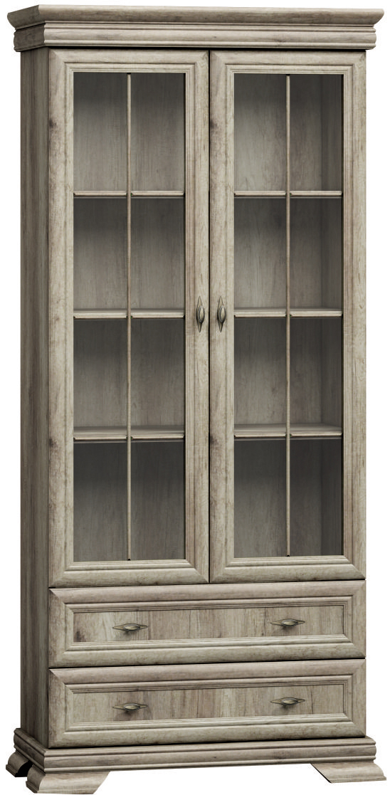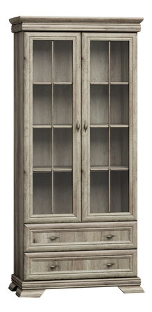 Vysoká vitrína s dvomi presklenými dvierkami a dvomi zásuvkami.