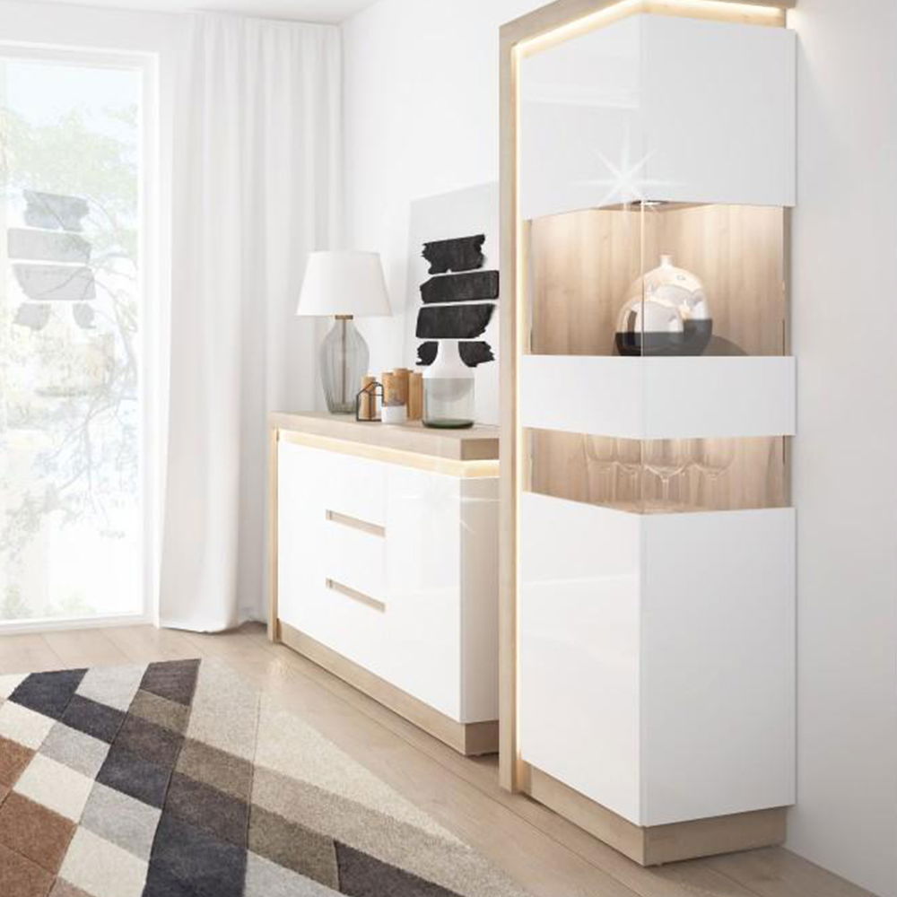 Vitrína Leonan 03 (s osvetlením) (P) s výškou 198 cm a hĺbkou 42 cm v farebnom prevedení dub riviera + extra vysoký lesk biely je moderným nábytkovým doplnkom pre Váš domov. Vitrína disponuje efektným LED osvetlením po obvode, ktoré spolu s dotykovým otváraním dvierok a tichým zatváraním soft closing vytvára príjemnú atmosféru. Materiál z DTD laminovaného dreva je odolný voči poškriabaniu a vlhkosti. Vitrína je dodávaná v demonte a je možné k nej priobjednať jedno alebo dvojbodové LED osvetlenie Square. S výškou 198 cm a hrúbkou materiálu 16 mm, táto vitrína je dokonalou voľbou pre tých, ktorí hľadajú moderný, ale funkčný nábytok pre svoju obývaciu izbu.