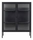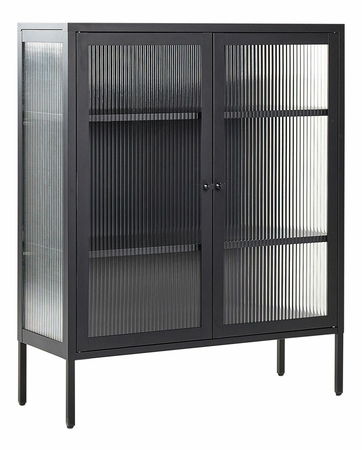 Doplňte svoj interiér o dekoratívnu vitrínu, ktorá zvýrazní vzhľad celého dizajnu. V tejto dvojdverovej skrinke si môžete vystaviť všetky svoje obľúbené vázy, riad alebo knihy, ktoré vytvoria špeciálny efekt vďaka ryhovanému sklu umiestnenému v prednej časti a na bokoch. Kus je vyrobený z ocele, ktorá zaručuje stabilitu a odolnosť a matný povrch v čiernej farbe dodáva očarujúci nádych.