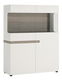 Nízka dvojdielna širšia leská biela vitrína, ktorá je v hornej časti oboch dielov uzavretá presklenými dvierkami. Vo vnútri vitríny je použitý odtieň dreva dub sonoma truflový je možné dokúpiť osvetlenie. Výrazný dizajnový prvok - pás v odtieni dreva dub sonoma truflový zasahujúci predné dvierka a ľavú stenu.