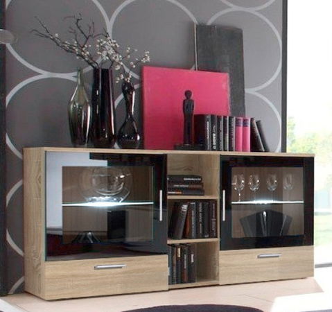 Vitrína Lyra moderného dizajnu je navrhnutá na využitie čo najviac úložného a odkladacieho priestoru. Za sklenenými dvierkami, ktoré sú olemované čiernym pásom, sa nachádza sklenená polička. Tá je pre zvýšenie efektu podsvietená LED osvetlením. V strednej časti je otvorený priestor s dvomi poličkami. Sklenené časti sú vyrobené z tvrdeného skla.