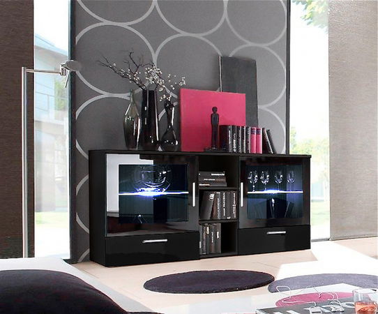 Vitrína Lyra moderného dizajnu je navrhnutá na využitie čo najviac úložného a odkladacieho priestoru. Za sklenenými dvierkami, ktoré sú olemované čiernym pásom, sa nachádza sklenená polička. Tá je pre zvýšenie efektu podsvietená LED osvetlením. V strednej časti je otvorený priestor s dvomi poličkami. Sklenené časti sú vyrobené z tvrdeného skla.