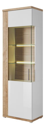 Elegantná vysoká vitrína s príjemným moderným dizajnom, ktorá dodá Vašej obývačke šarm a vytvorí z nej útulné miesto. Presklená časť má dve sklené poličky, kam si môžete poukladať obľúbené sklo, poháre, dekorácie, alebo knihy. K vitríne si môžete priobjednať aj LED osvetlenie sklených poličiek.