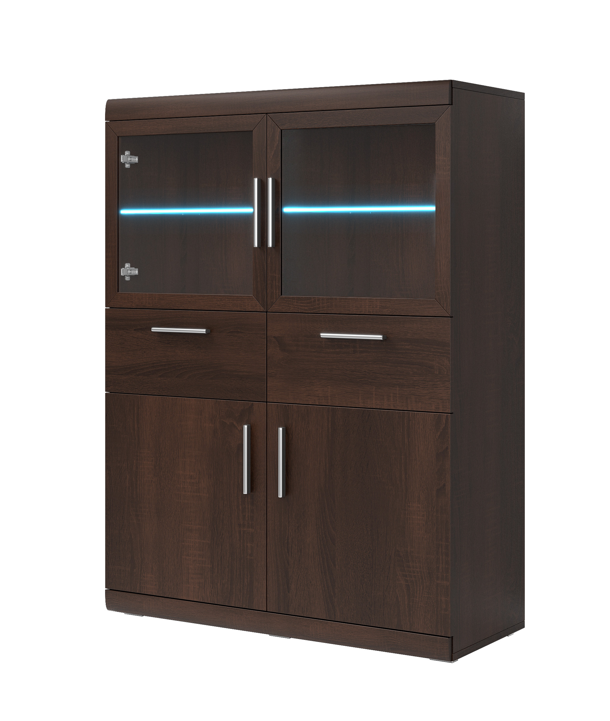Vitrína Merope je praktický a elegantný kus nábytku ideálny do obývačky, pracovne alebo kancelácie. Horné dvierka sú presklené a sklenaná polička je vybavená LED podsvietením, takže je ideálna na dekorácie a veci, na ktoré ste pyšný. V spodnej časti sú dvierka plné a schovajú to, čo nemá byť na očiach podobne ako 2 zásuvky. Tmavá vitrína s jednoduchým dizajnom sa hodí do každej moderne zariadenej miestnosti.