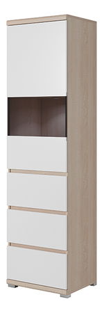 Vysoká vitrína, ktorá má presklennú poličku s led osvetlením, ktoré si viete za doplatok zakúpiť. Praktické zásuvky Vám posktnú dostatok miesta pre Vaše doplnky.