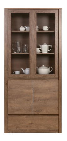 Elegantná dvojdielna vitrína s 3 poličkami za sklom, dvomi plnými dvierkami s policami pod vitrínou a hlbokou zásuvkou na spodku. Farebné prevedenie dub lefkas má špecifickú kresbu a dodáva až rustikálny výraz masívneho neopracovaného dreva, pokiaľ to tak môžeme vôbec povedať.