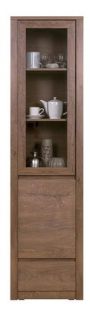Vysoká a úzka vitrína s tromi policami za sklom. Pod vitrínou sa nachádzajú plné dvierka s policami a pod ňou je na spodku hlboká zásuvka. Farebné prevedenie dub lefkas má špecifickú kresbu a dodáva až rustikálny výraz masívneho neopracovaného dreva, pokiaľ to tak môžeme vôbec povedať.