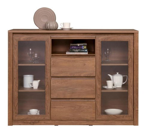 Široká trojdielna vitrína s dvomi presklenými dvierkami s čírym sklom po stranách. V strede sa nad sebou nachádzajú tri zásuvky a hore nad nimi je umiestnená otvorená polička. Farebné prevedenie dub lefkas má špecifickú kresbu a dodáva až rustikálny výraz masívneho neopracovaného dreva, pokiaľ to tak môžeme vôbec povedať.