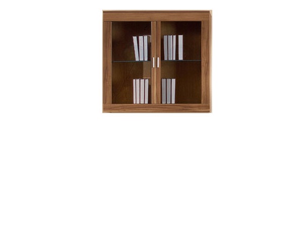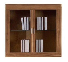 Vitrína na stenu s dvomi dvierkami s čírim sklom a sklenenou poličkou.