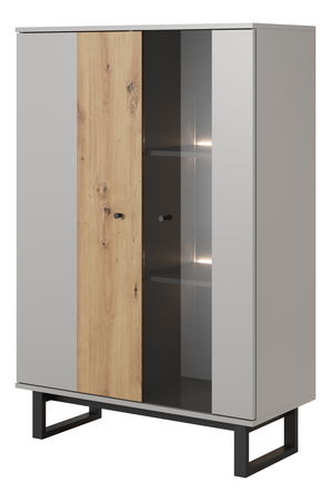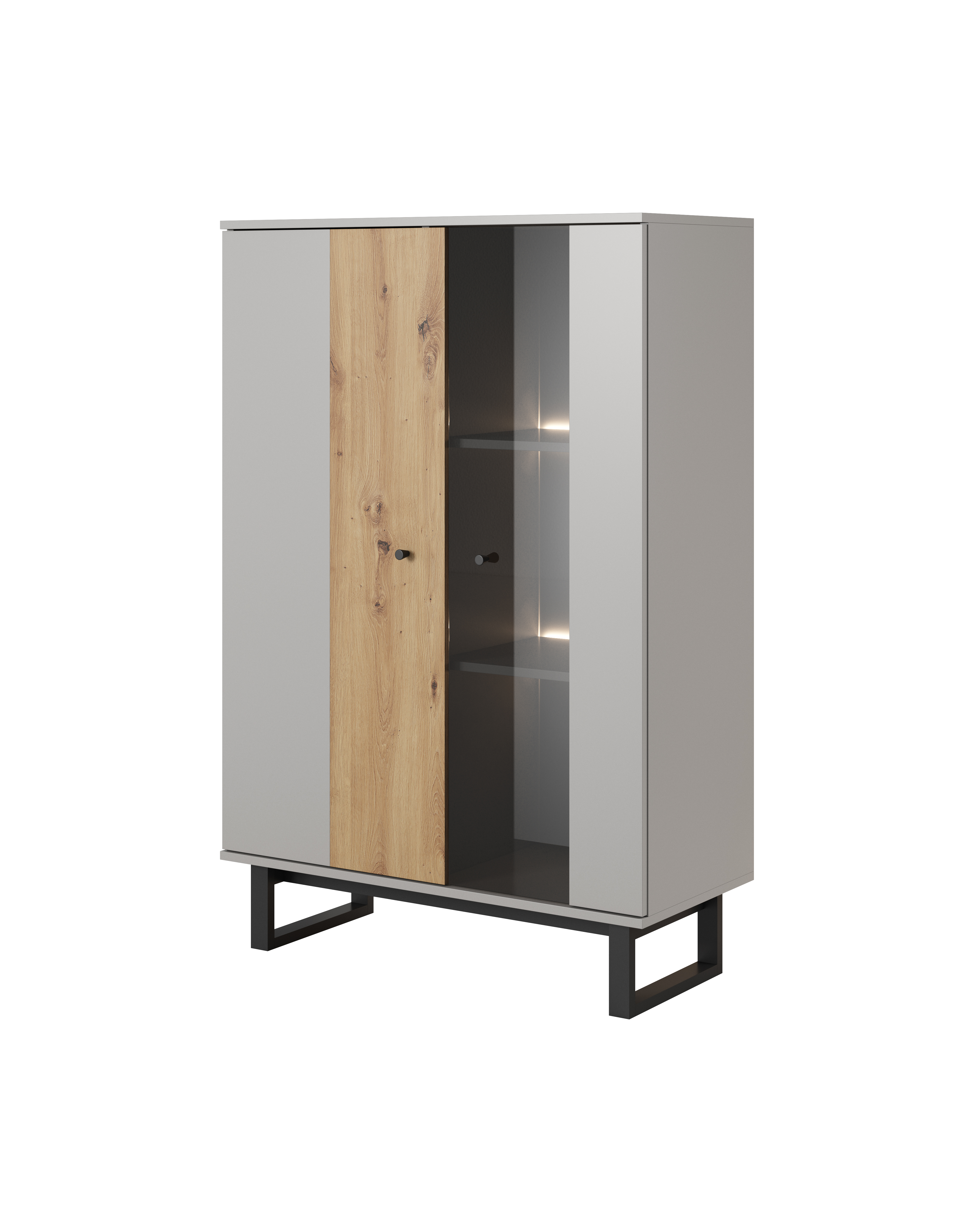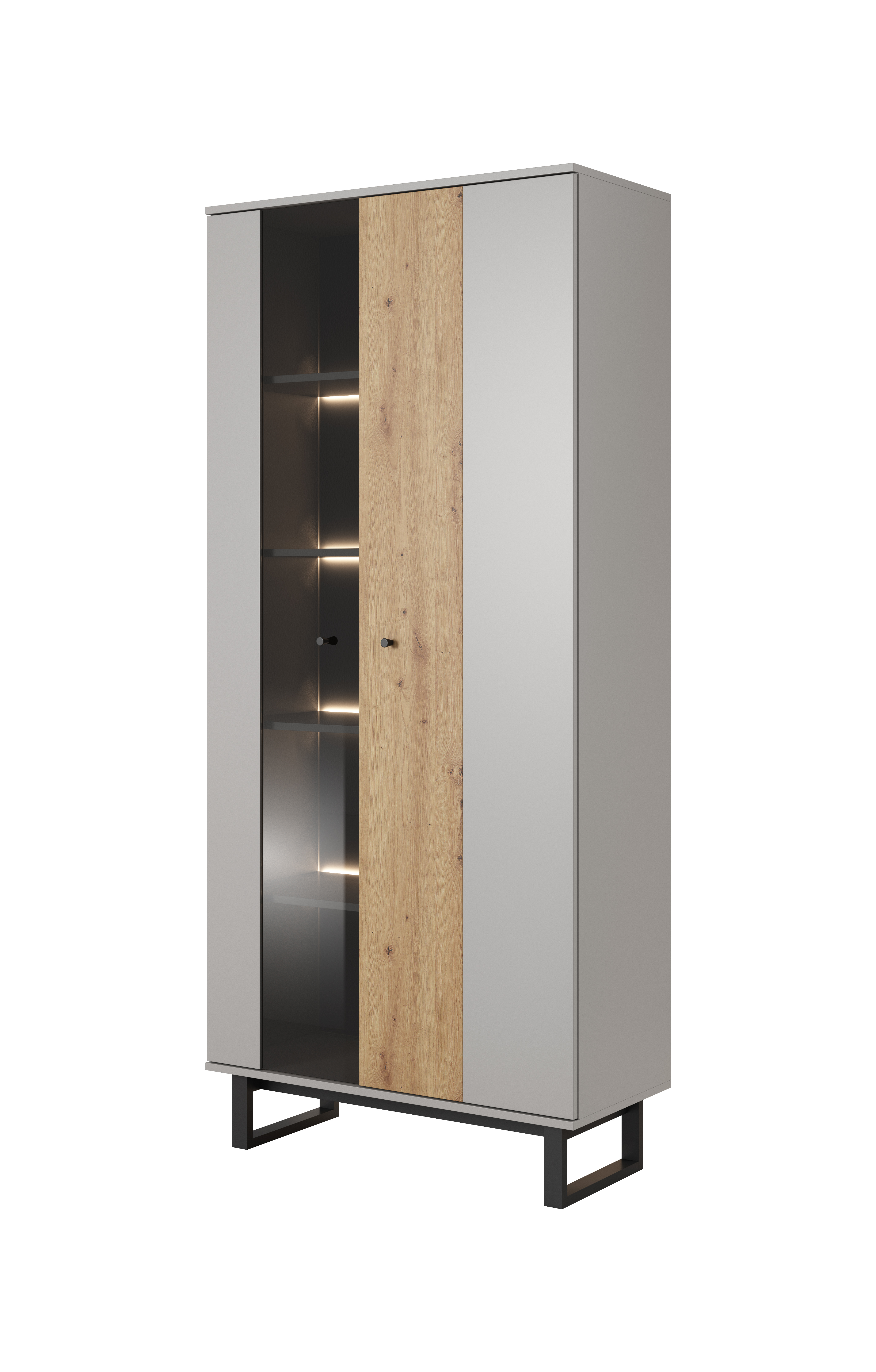 Vitrína nízka Galaxit s výškou 90 cm a hĺbkou 40 cm je ideálnym doplnkom pre váš interiér. V kombinácii platinovej sivej farby s prírodným dekorom dub artisan vytvára v miestnosti jedinečnú atmosféru. Vitirína je vyrobená z kvalitnej 16 mm laminovanej dosky odolnej proti vlhkosti a poškriabaniu v farbe platinovej sivej. Predná strana vitríny je tiež vyrobená z 16 mm laminovanej dosky odolnej proti vlhkosti a poškriabaniu vo farbe korpusu s ABS hranami a tmavým tvrdeným sklom. Zadná strana je vyrobená z grafítového HDF. Vitrína má kovové čierne uchytky a nožičky z matnej čiernej farby kovu. Výstuž tvorí preglejka v čiernej matnej farbe. Sklenená predná časť vitríny je z tmavého temperovaného antisol skla. Vitirína disponuje aj možnosťou priobjednania LED osvetlenia.
