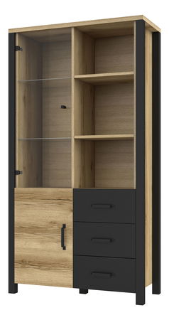Vitrína Oralee Typ 13 (dub grand natural + čierna matná) je praktický a elegantný nábytok vhodný do každej domácnosti. S výškou 191 cm a hĺbkou 43 cm ponúka dostatok úložného priestoru v podobe políc aj zásuviek, v ktorých môžete uložiť svoje predmety a vyhnúť sa tak neporiadku v izbe. Kovové nožičky zabezpečujú stabilitu a pevnosť vitríny. Materiál laminovanej dosky je odolný voči poškriabaniu a iným mechanicým poškodeniam. Vneste do svojho domova nádych lesa s industriálnym nábytkom zo série Oralee. Na dokúpenie je LED osvetlenie, ktoré dokonale zvýrazní vystavené predmety. Úchytky vitríny sú plastové a lišty zásuviek majú guľôčkové pojazdy s možnosťou plného vysunutia. Táto vitrína je v kombinácii Dub Grand Natural + Čierna Matná, čo ju robí skvelou voľbou pre každý moderný interiér.