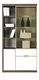 Vysoká dvojdielna vitrína. Ľavá časť obsahuje sklenené dvierka vo vrchnej časti a drevené dvierka v časti spodnej. Stred tvori jedna zásuvka. Pravá časť vitríny je policová skrinka s jednými dvierkami v spodnej časti, vrchná časť je otvorená a pozostáva zo štyroch odkladacích priestorov.