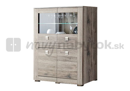 Nízka vitrína s presklenou hornou časťou a so sklenenou poličkou. Dolná časť má plné dvierka a klasickú poličku. Dizajnové úchyty a farba dreva san remo dodávajú nábytku klasický charakter. Nábytok je postavený na decentných nožičkách.