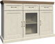 Nízka vitrína s jednými presklenými dvierkami v strede dole, dvomi poličkami dvierkami po stranách a 3 zásuvkami (príborník) umiestnenými pod hornou masívnou doskou