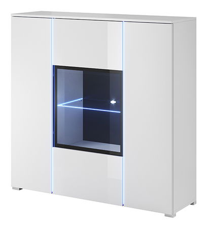 Široká trojdverová komoda, po stranách ma police a tým ponúka dostatok priestoru. V strede si za presklenné dvere viete vyložiť nejké doplnky, led osvletlenie si viete dokúpiť za doplatok.