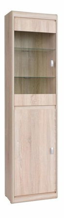 Užšia a vyššia vitrína s vrchnou presklenou časťou, v ktorej krásne vyniknú Vaše dekorácie. V spodnej časti sa nachádzajú dvierka a za nimi ďalšie praktické poličky. Dvierka vitríny majú plastové úchyty. K vitríne si môžete priobjednať efektné osvetlenie sklených poličiek. Ľavé prevedenie vitríny.