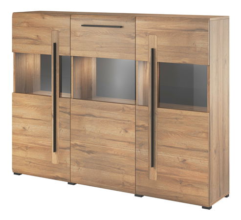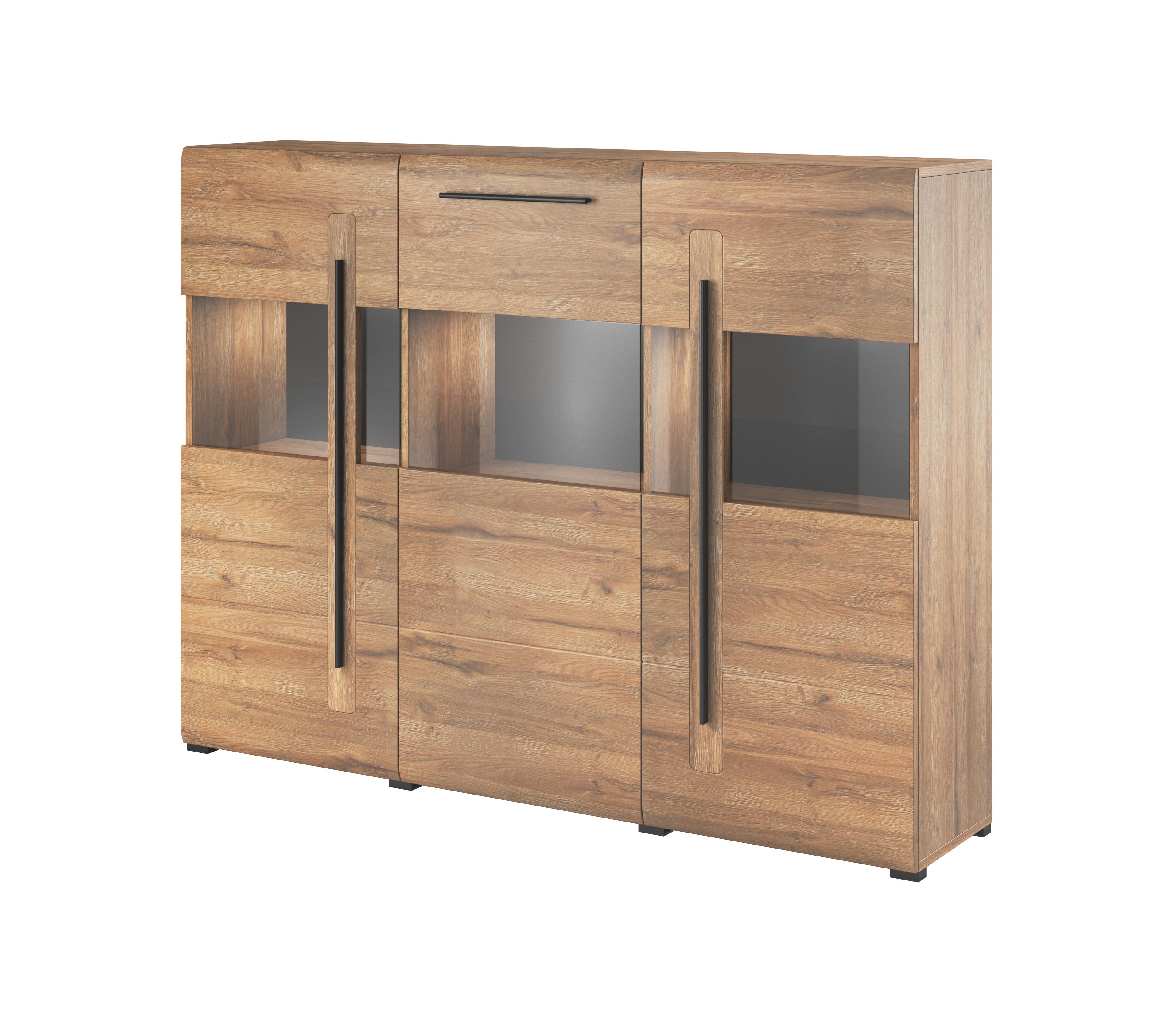 Priestranná vitrína, ktorá sa bude krásne vynímať vo Vašej obývacej izbe, alebo pracovni. Vyniká moderným a príjemným dizajnom s jemne zaoblenými frontami a vyrezávanými tenkými líniami. Poskytuje aj dostatok úložného priestoru. Vitrína má troje presklené dvierka. Dvierka majú tenké podlhovasté úchyty. K vitríne je možné priobjednať si efektné LED osvetlenie.