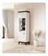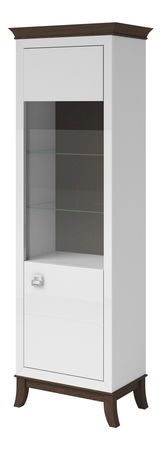 Táto vysoká a úzka vitrína je štýlovým a praktickým riešením pre vystavenie dekorácií či cenností v modernom interiéri. Vyrobená z kvalitnej laminovanej drevotriesky s ABS hranami, ponúka odolnosť a dlhú životnosť. Vitrína stojí na nožičkách z masívu, ktoré pridávajú na stabilitu a prírodný vzhľad. Má jedny dvierka vybavené tichého zatvárania, čo zaručuje komfortné a nerušené používanie. Vo vnútri nájdete dve sklenené a tri drevené police, ktoré umožňujú praktické rozdelenie a estetické usporiadanie vystavených predmetov. K dispozícii je tiež možnosť pridať osvetlenie za príplatok, čím sa zvýrazní celkový vzhľad a atmosféra vitríny.